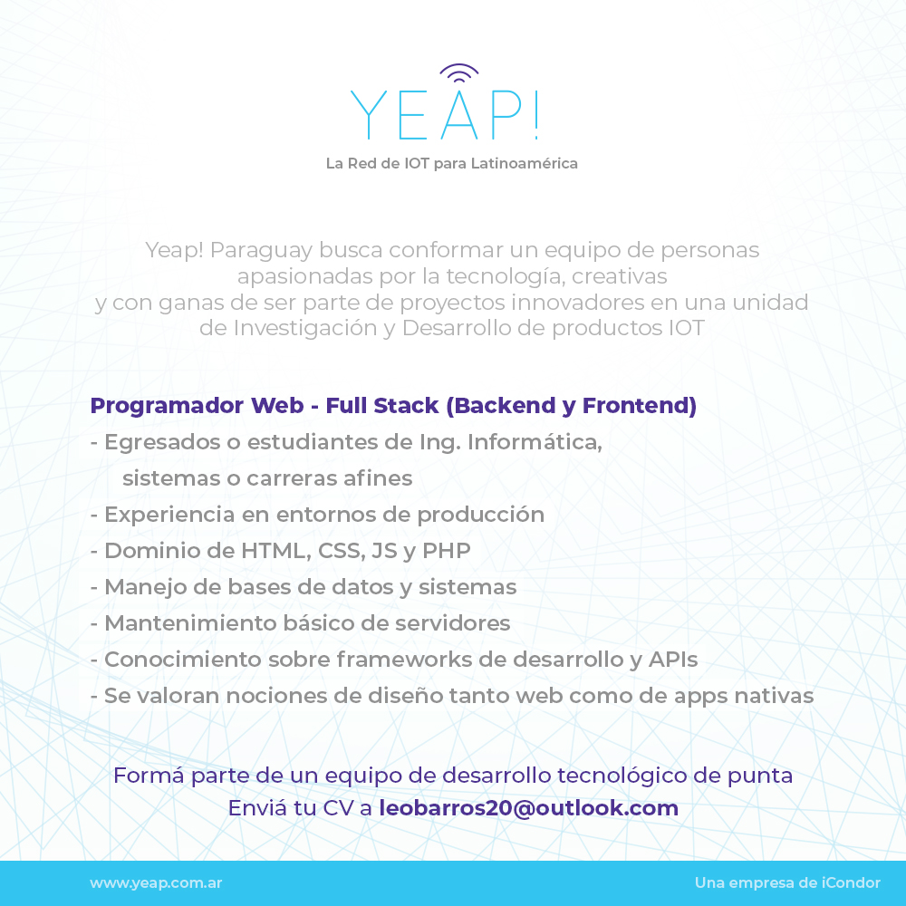 Buscamos estudiantes que quieran realizar Pasantía en una importante empresa, con posibilidades de formar parte del equipo, la pasantía tiene una remuneración convenida, los interesados pueden enviar su C.V al correo This email address is being protected from spambots. You need JavaScript enabled to view it. o al correo de la Secretaría del Departamento DEI This email address is being protected from spambots. You need JavaScript enabled to view it.